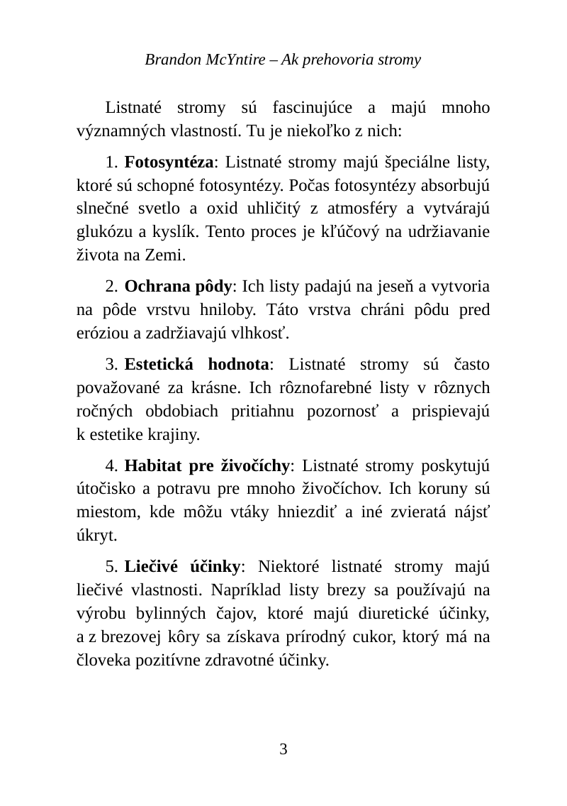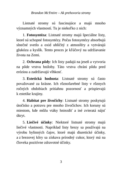 Filozofický pohľad na tému „Ak prehovoria stromy" odhaľuje neuveriteľné schopnosti listnatých stromov a ich neobvyklý potenciál v liečbe najťažších chorôb. Táto filozofia stavia na myšlienke, že stromy nie sú len nehybné rastliny, ale živé entity s liečivými schopnosťami, ktoré môžu vyliečiť rôzne choroby: rakovinu, obličkové ťažkosti, rôzne zápaly, choroby priedušiek či čriev. Schopnosti listnatých stromov sú obzvlášť vo fascinujúcom kontexte s ich prírodnými vlastnosťami a ich potenciálnymi medicínskymi aplikáciami. Existujú početné príbehy a dôkazy, ktoré podporujú túto ideu, čo vedie k zamysleniu sa nad tým, akú úlohu môžu stromy zohrať v budúcnosti medicíny. Význam týchto stromov presahuje ich ekologickú hodnotu: sú životne dôležité pre ľudstvo nielen ako zdroj kyslíka a ako dôležitá súčasť biotopov v komplexne s inými druhmi biotopov, ale môžu byť aj potenciálnymi liečiteľmi a priniesť revolúciu do zdravotnej starostlivosti. V dnešnom ponímaní je to alternatívna medicína. Tento pohľad vyzýva k hlbšiemu pochopenia našej prepojenosti so stromami a s prírodou, a to pre ich skrytý potenciál, ktorý je odhalený len čiastočne a môže priniesť nesmierny úžitok pre ľudstvo.