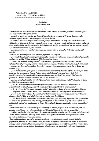 Kniha je životným príbehom jednej veľkéj lásky mladej dievčiny,ktorá sa zamiluje do staršieho muža veľkou láskou a iba tomuto mužovi je ochotná z veľkej lásky dovoliť splodiť spoločného potomka.Osud bol však k obom zamilovaným príliš krutý o príliš nemilosrdný ,lebo starší muž bol veľmi ťažko chorý a namiesto pokračovania tejto veľkéj lásky sa dožili strašníj skutočnosti,že v deň smrti tohto muža v krátkosti asi dvoch hodín po jeho smrti uzrel svetlo sveta jeho syn a danom momente mladá žena pocítila zlom ich obrovskej lásky.Toto je prvý diel trilógie,ktorého ďalšie diely budú následne vychádzať.